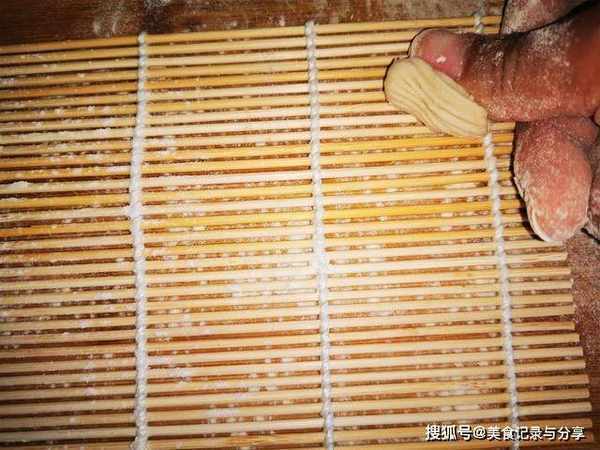 6、拿来一个盖帘,或者是做寿司用到的寿司卷,我今天用的是寿司卷,拿来一个小面块,用大拇指把面搓在寿司卷上,就出来一个花型,这就是我们今天的猫耳朵面了,做起来很简单呢,接着把剩下所有的面团都搓成这样形状的。