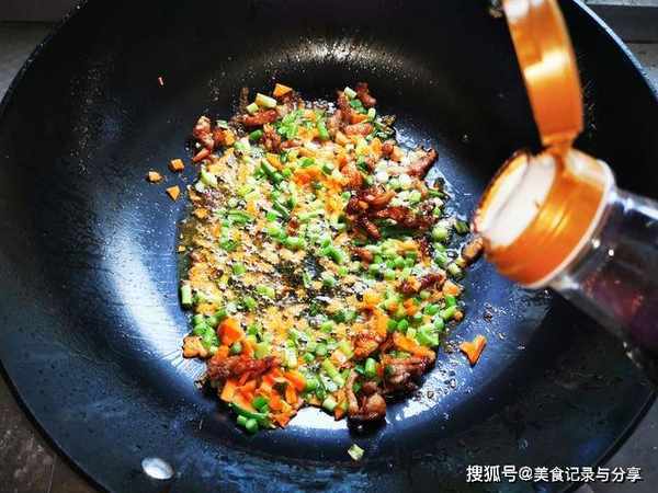 9、接着倒入胡萝卜丁和蒜苔末一起翻炒,加入生抽,适量老抽翻炒均匀。