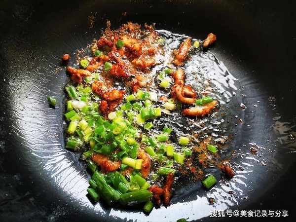 8、猪肉也腌制好了,起锅烧油,油热后,放入肉丝煸炒,加入葱末姜末炒出香味。