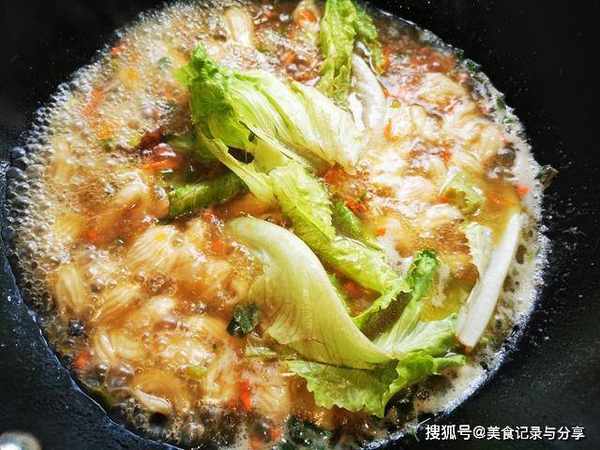 10、锅中倒入清水,大火煮开,下入猫耳朵面,转小火煮上5分钟,最后放入几片生菜叶子,加点食盐就可以出锅了。