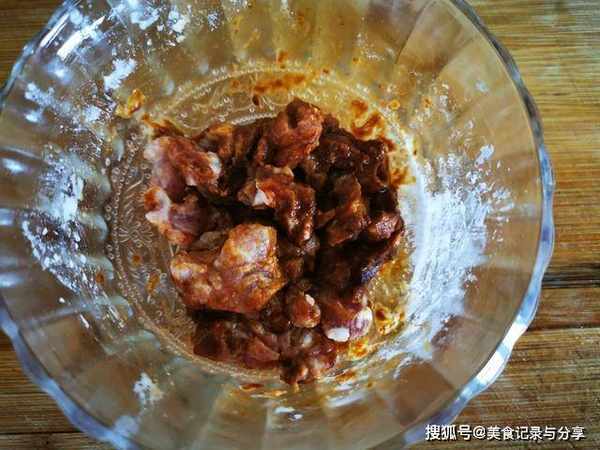 3、切一点瘦肉,加生抽,料酒,淀粉拌匀腌制10分钟。