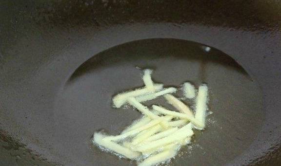 4、炒锅上火烧热,放食用油,温热后放姜丝炸一下;