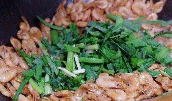 9、在翻炒的过程中虾身变红,把韭菜放进锅里;