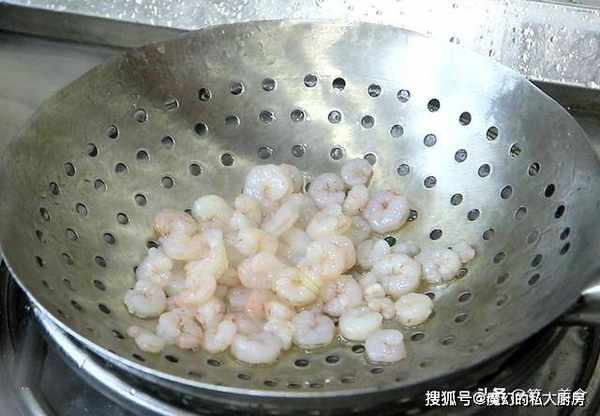 锅内再烧水,倒入虾仁,快速煮30秒钟,虾仁微微变红以后倒出来,用清水冲洗干净,控水备用,虾仁焯水的时间不要太长,否则鲜味会流失,口感会不够嫩。