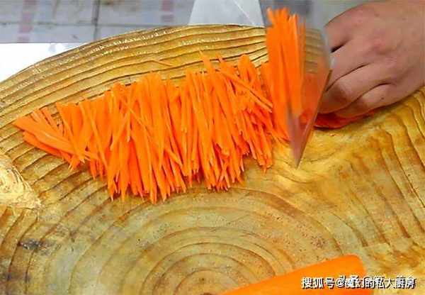 准备胡萝卜两个,削去外皮后冲洗一下,先切成薄片再切成细丝,放入盆中备用。
