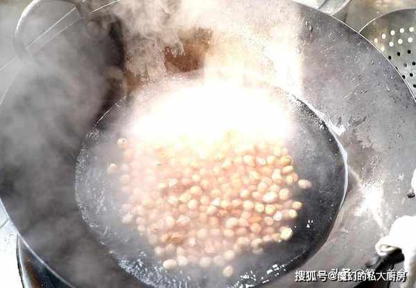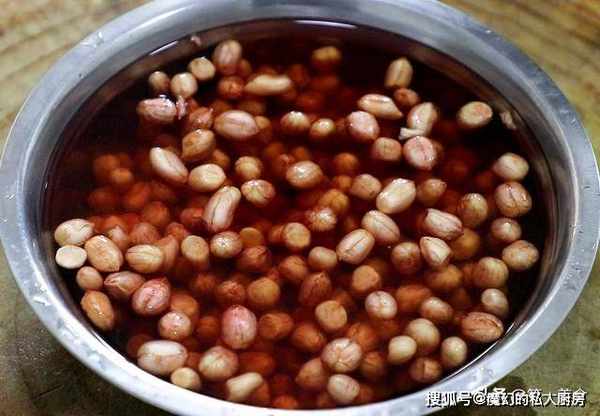 锅中烧水,水烧开以后倒入花生,把花生煮至微微鼓起,表面发亮时倒出用清水冲洗,冷却控水备用,清水冲洗可以保持花生清脆的口感。