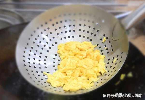 把锅烧热,加入植物油滑锅,锅内冒青烟时,倒出热油加入凉油,六成油温时倒入鸡蛋液,鸡蛋全部定型以后,用炒勺打散立即倒出来,切记不要久炒,容易把鸡蛋炒老。
