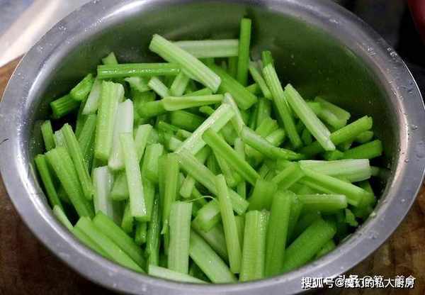 准备芹菜一把,摘好以后从中间破开,切成3厘米长的段放入盆中,加入食盐3克,翻拌均匀腌制10分钟,芹菜遇盐出水,更容易吸收料汁入味。