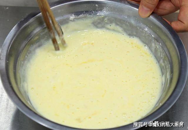 在碗中打入三个鸡蛋,加入少许食盐入底味,淋入一点芝麻香油,用筷子搅散,倒入300毫升的纯牛奶搅拌均匀备用。