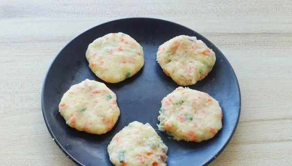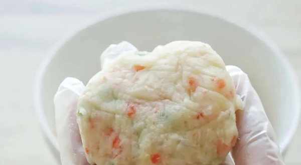 3、用水将我们的双手打湿,取适量土豆泥,搓成球状,再用手心按压成小饼状;