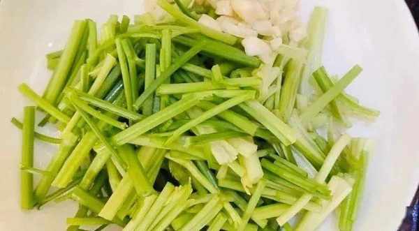 2、然后我们将芹菜摘洗干净,切成小段,再切点蒜末、姜丝和小米辣提味,不吃辣可以不放辣椒;