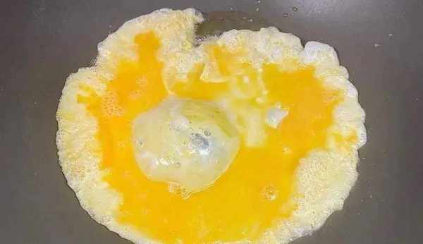 2、热锅加油,先倒入蛋液,小火煎至变凝固后,将鸡蛋铲成小块,盛出来备用;