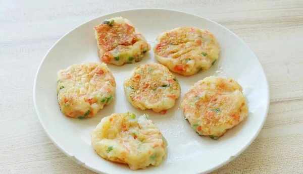 2、接下来将蒸好的土豆,压成泥状,用擀面杖或勺子都行,然后往里面加一些我们爱吃的配菜,如胡萝卜碎、虾仁碎等等,再放点十三香、食盐和葱花进去,最后放2勺面粉,搅成不粘手的面团;