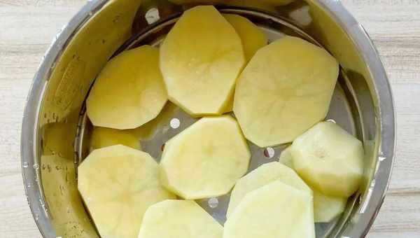 1、我们先将土豆洗干净,刨去外皮后,用刀切薄片,然后放入蒸锅中,隔水蒸15分钟后,取出来放入碗中;