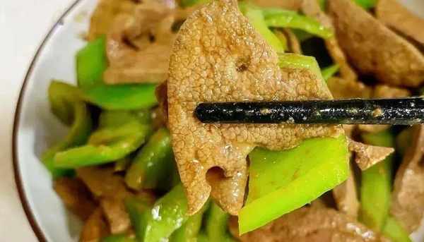 3、热锅加油,下姜蒜炒香后,倒入青椒,翻炒2分钟,再倒入猪肝,大火翻炒5分钟后,往锅中加一些生抽、蚝油,炒匀即可盛盘。