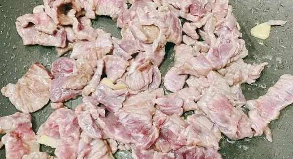 3、热锅加油,放入姜丝炒香,先倒入牛肉,大火快速炒至牛肉变色后,将牛肉盛出来;