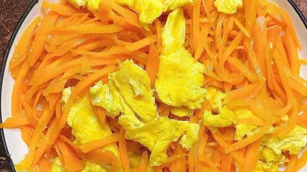 3、另起锅加油,下蒜末炒香,再倒入胡萝卜,大火翻炒3分钟,至胡萝卜完全熟软后,倒入鸡蛋炒匀,然后往锅中加一些生抽、蚝油调味,就可以出锅了。