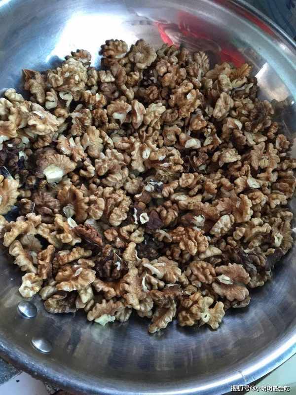 5、晾芝麻的同时,可以先用小火烘一下剥好的核桃仁。可以自己剥出一颗颗核桃仁,也可以去店里买现成的,这不影响食用。因为核桃的油脂含量比较高,所以还挺容易熟的,用小火把两面烘一烘即可。用烤箱烤也是一个不错的选择,温度调到180度,时间为3分钟,差不多就够了。