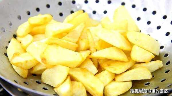 3.下面, 我们把土豆过油炸一下,锅内烧油,油烧至5成热,油面上微微冒烟时,把土豆用清水冲洗几次后,洗去土豆表皮的淀粉,倒入锅内炸3分钟左右,这个过程,一直保持中火,炸至外皮变硬,金黄,倒出控油。