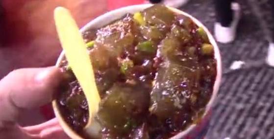 有客人要的时候老板只要轻轻的翻炒几下就可以了,所以制作简单,但是味道却很好,小编看了半天都馋了,所以也买了一份,热气腾腾的炒凉粉吃在嘴里入口热鲜香嫩,凉粉滑嫩不碎,这时候小编才明白这小伙生意这么好是有原因的,不知道在你们的城市有这种小吃吗?24岁小伙下班后夜市摆摊卖“简单小吃”6元一份!收入比工资高!
