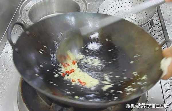 锅内烧油,倒入蒜末和小米椒炒出蒜香味。