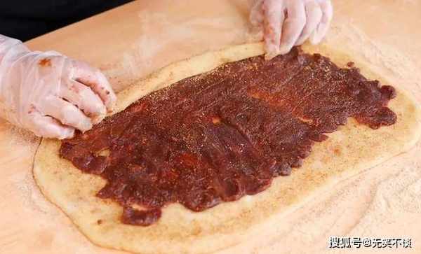 7、将糯米面团摊开,表面放一层豆沙馅料,随后卷起来。