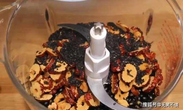 4、黑豆、黑芝麻、红枣,都放在搅拌机中,启动机器搅碎。
