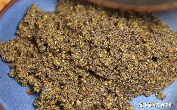 7、倒入搅碎的粉末,炒1分钟,将粉末炒湿润。