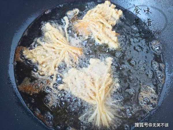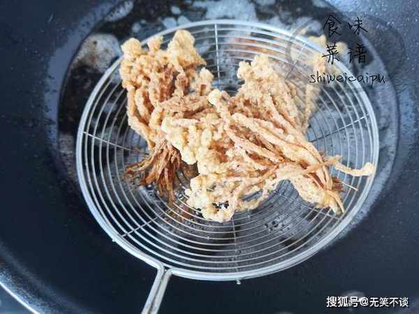 1、高温油炸,要注意别被油溅伤到,所以在烧锅至干锅无水再倒入油,下入金针菇时用筷子夹住。