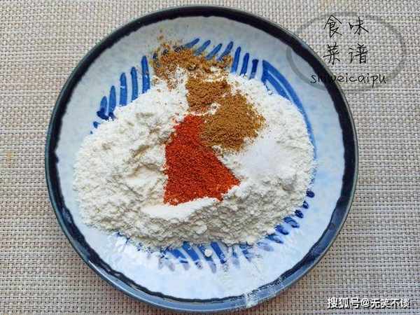 3、盘子中加入80克普通面粉,放入3克食盐,4克孜然粉,3克辣椒面,用筷子将调味品搅拌均匀,与面粉混合在一起。