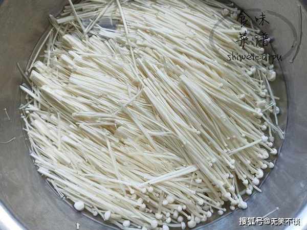 2、金针菇用调料拌好后,尽量及早下锅,因为盐会让让金针菇出水,可以边加热油锅,边制作调料。