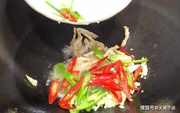 10、随后放青红辣椒、大蒜、葱段等配料。翻炒香味出来。