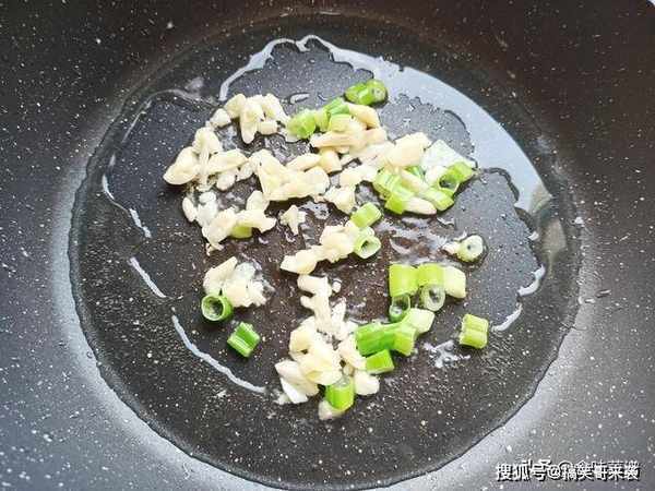 8、锅内烧油,倒入葱、大蒜,炒出香味。