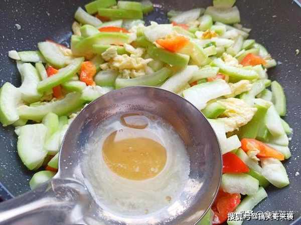 9、倒入瓠子和鸡蛋,根据个人口味,加入食盐、味精、鸡粉、芝麻油,用水化开后,倒入锅内,快速翻炒几下,过程大约40秒,出锅即可。