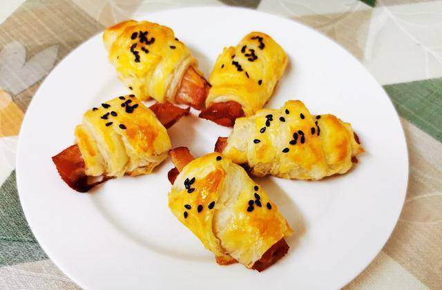很多家庭主妇都在愁给自己孩子做什么早餐他们会比较爱吃,因为喂小孩子吃饭是一件非常困难的事情,他们好像天生的就不太爱吃,所以要变着花样给他们吃,这些早餐当作年轻人的早餐也很合适的,每天也思考一下做不同的花样给自己吃,这种简易版的牛角包香肠,其实是用手抓饼做的,手抓饼包上一个香肠就可以了,手抓饼对半切开一半,然后把香肠卷起来放在锅里面炸,当然再下锅之前要裹上一层蛋液,这样子色泽就看起来金黄色,更有食欲一些,洒上黑色的芝麻,看起来金灿灿的。