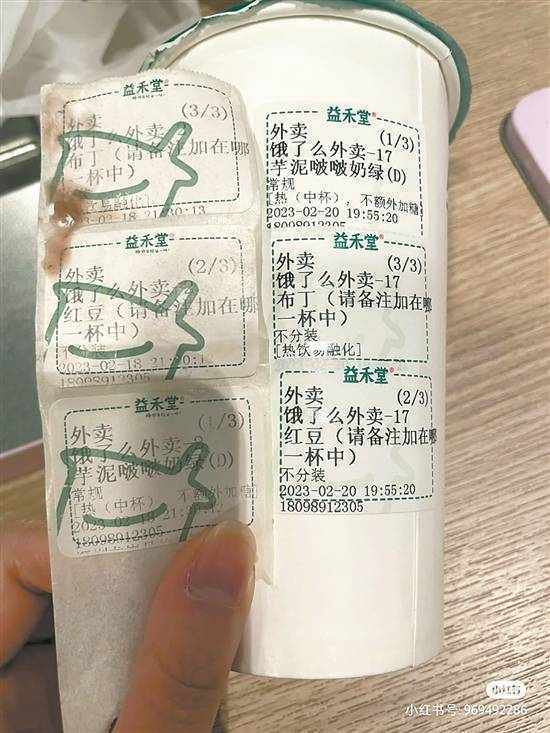 2月19日,该消费者在小红书爆料称,因饿了么做活动赠送的10元红包,在益禾堂丹竹头店下单一杯“芋泥啵啵奶绿”,奶茶送到后喝了一半,发现里面足足有3个标签,标签字体都泡模糊了;隔日,该消费者早期出现腹泻、冒汗、低烧等症状,与该店店长等前往深圳市第三人民医院就诊,诊断出细菌感染、轻度脱水、消化道有点损伤。