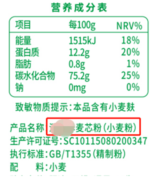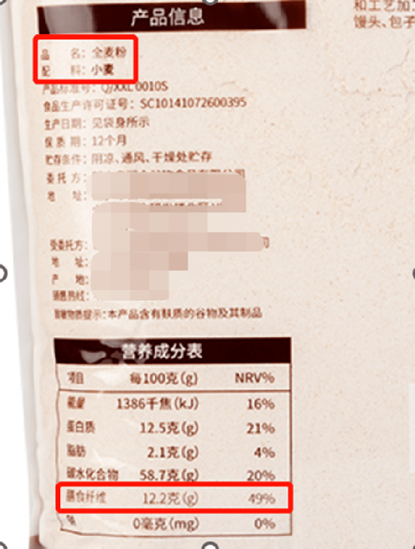 如果是选全麦粉,也要看下膳食纤维的含量,由我国国家粮食局颁发的粮食行业推荐性标准《LS/T 3244-2015 全麦粉》中规定,全麦粉的膳食纤维含量需≥9%,买的时候最好选择相对含量较高的一款,可以多补充一些膳食纤维。