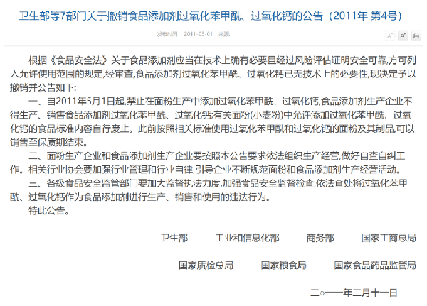 考虑到饮食安全性,我国在2011年5月1日起规定禁止在面粉中添加过氧化苯甲酰。