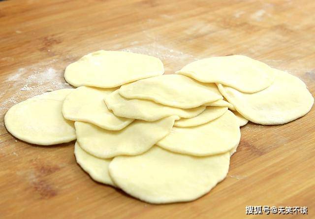 5.面饧好以后案板上撒上底面,把面团取出来多揉揉,揉光滑再搓成长条,揪成大小均匀的面剂子,一个一个摁扁,擀成中间厚、两边薄的饺子皮。