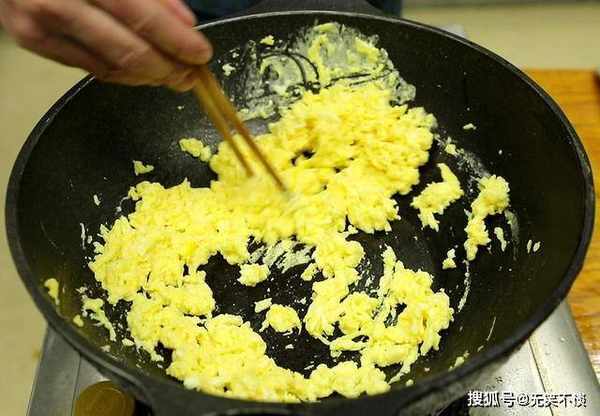 3.碗中打入几个鸡蛋,搅拌打散成蛋液,把鸡蛋凉油下锅炒一下,用筷子搅散,全部定型以后倒出来,这样炒出来的鸡蛋又碎又嫩,出锅就不用切了。