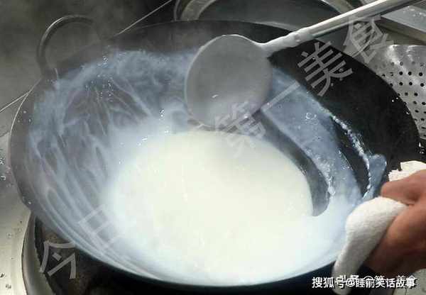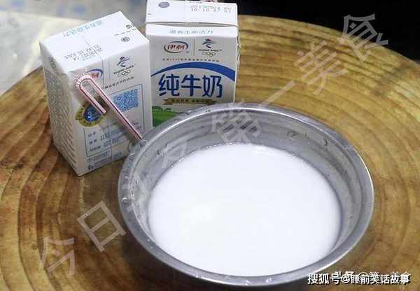 锅内烧水,水烧开以后把牛奶倒入锅中,煮至牛奶沸腾,倒入准备好的水淀粉,利用淀粉预热糊化的特性增加牛奶的黏性,方便后期整理成型而且不易松散,保持小火不停地搅拌,防止糊锅,大约熬制5分钟,熬出牛奶中的水分,牛奶呈粘稠的糊状时起锅。