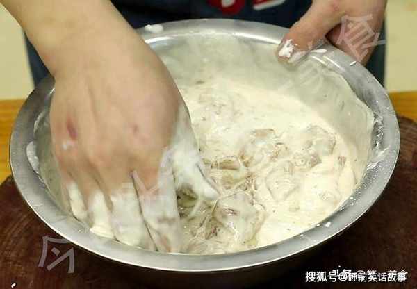 准备适量的红薯淀粉放入盆中,倒入一点泡打粉方便起酥,一边加入温水一边搅拌,调成稠一点的面糊,抓起来不会轻易的掉落即可,把腌好的鸡块放进去抓拌均匀,让每一个鸡块都均匀地裹上面糊。