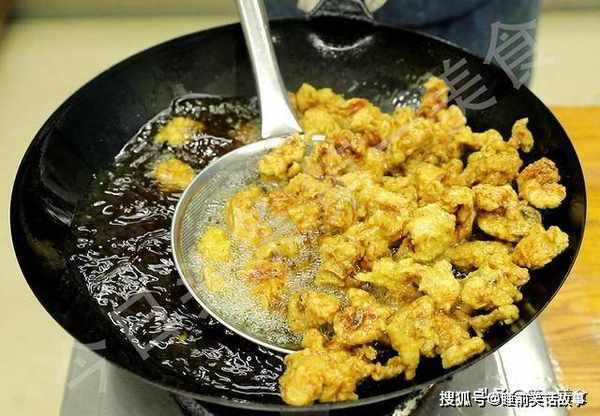 把油温升高至6成热时,倒入鸡块再复炸一遍, 一是吐油防止发腻,二是能使鸡块更加的金黄酥脆,复炸1分钟后即可捞出控油。