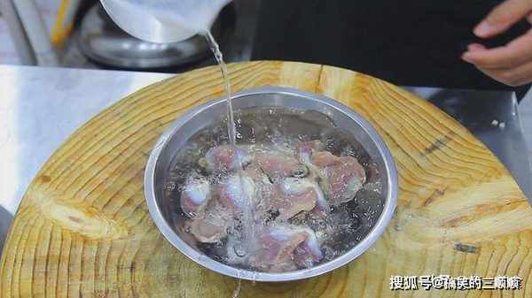 我们开始进行下一步,下面我们先把鸡胗焯一下水:锅中加入清水,把鸡胗凉水下锅。