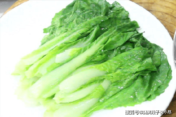 锅内烧水,放入少许食盐和植物油,锁住营养保持翠绿,水烧开后倒入生菜,快速汆烫10秒钟,生菜塌软以后立即捞出,控过水以后茎朝着一个方向摆放在盘中。