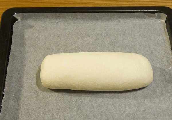 4、把面团整圆,放在搅拌盆内,进行一次发酵约50分钟。取出发酵完成的面团,轻压排出空气后,滚圆醒面10分钟。使用擀面棍把面团擀开,往前卷收成长柱状,收口紧密捏合。面团收口朝下,放在铺有烘焙纸的烤盘上,进行二次发酵约45分钟。