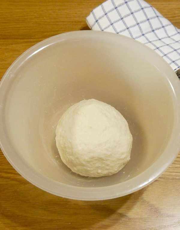 2、把面团放入搅拌盆内,盖上拧干的湿布,静置20分钟,此时面团表面已呈现细緻光滑状态,把面团从底部翻折几次,再次静置20分钟。