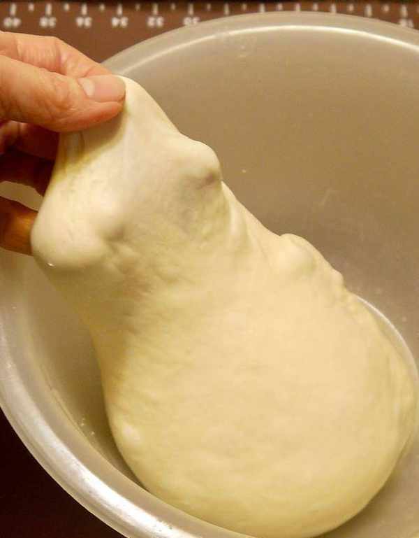 3、依此步骤再重复一次即完成揉面(面团经过三次静置共60分钟),轻拉面团会发现面团的延展性极佳。