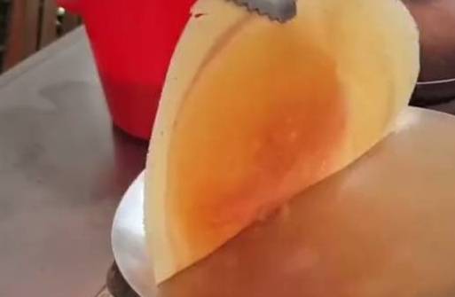 问过老板才知道这是一种用面粉在里面放上适量的牛奶,再放上鸡蛋搅拌而成的面糊,这面糊里看着是黄色的,加了鸡蛋小编想也不会这么的黄,问过老板才知道原来这面糊里面除了放鸡蛋里面还放了芒果汁,新鲜的芒果榨橙汁,然后倒在面粉里面一起和成面糊!