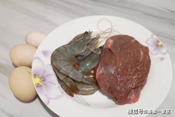 食材:鸡蛋3个、猪肉150克、虾200克、料酒1勺、腌番茄10克、胡椒粉、盐、油。